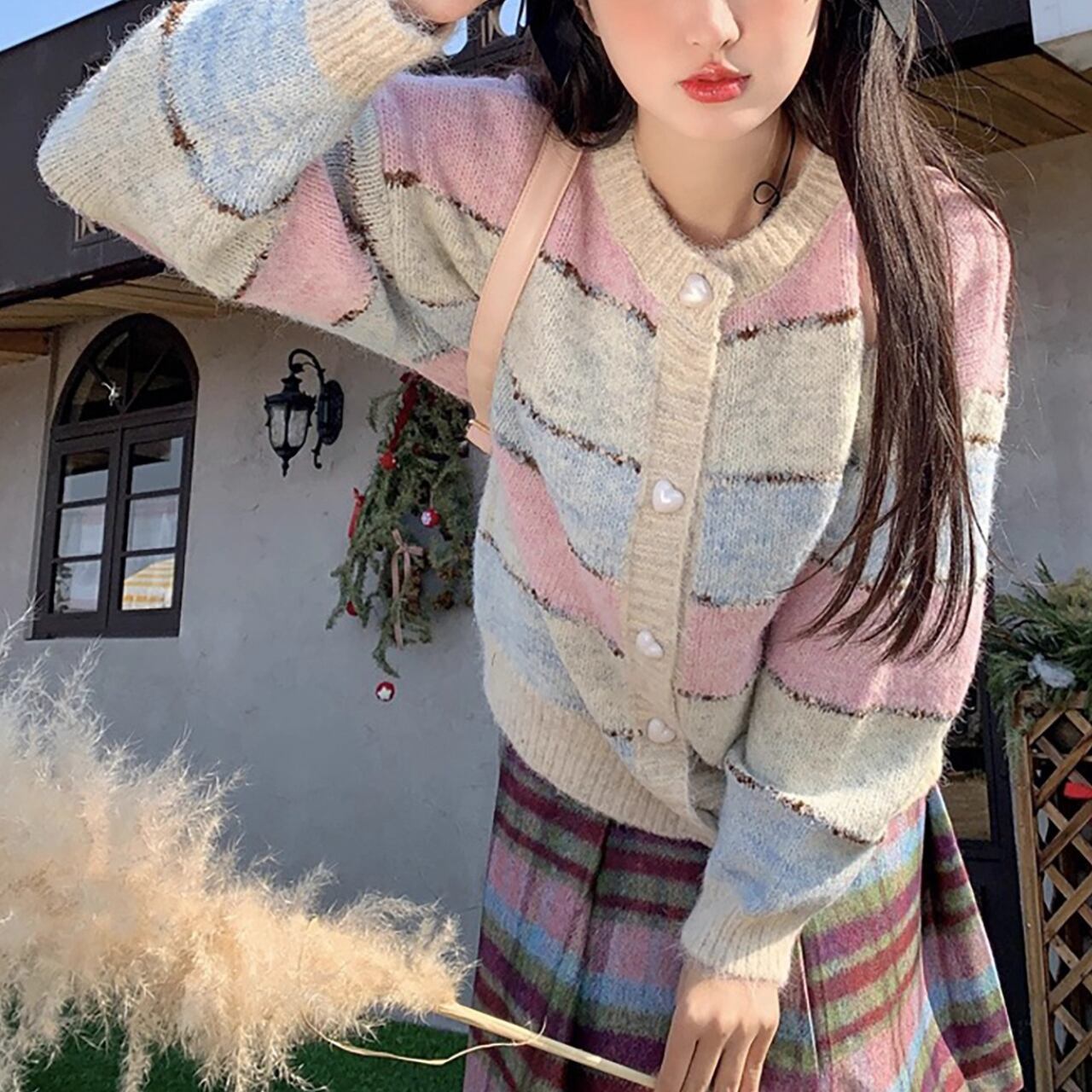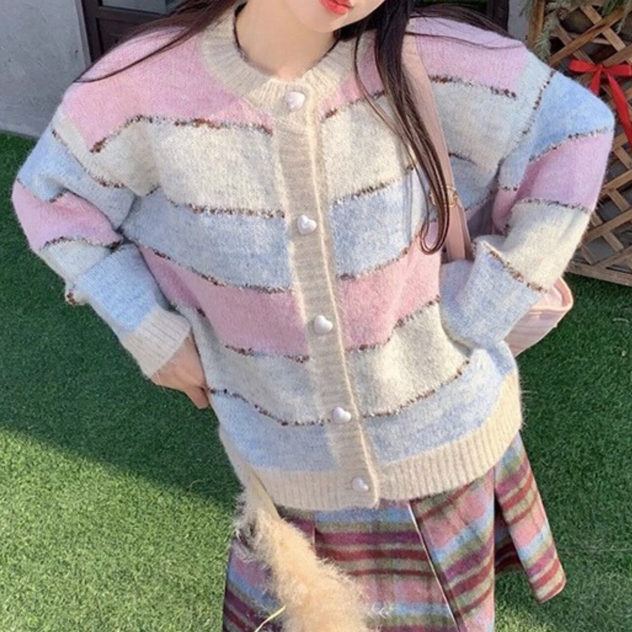 ハートボタンパステルボーダーカーディガン R01472